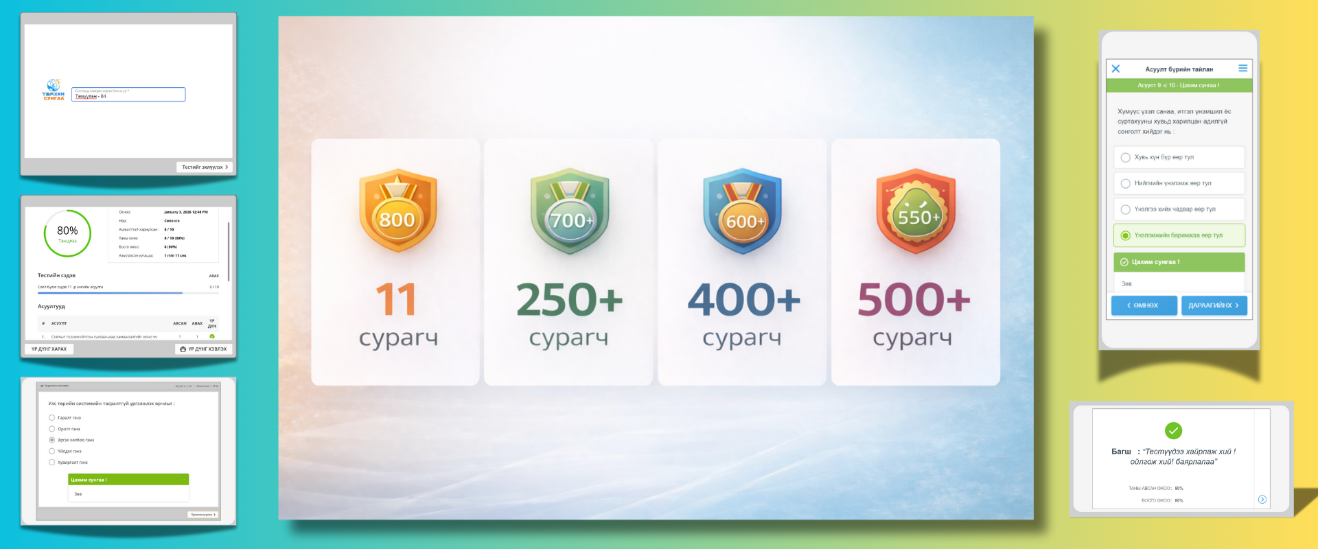 Дахин давхцахгүй, 2000+ шинэ тестийн сангаас зөвхөн чамд зориулсан, бүлэг сэдэв, нийт агуулгын бодит түвшинг тогтоох автомат холилттой 60 асуултаар шалгалт өгч өөрийнхөө ахицыг дүгнэнэ.